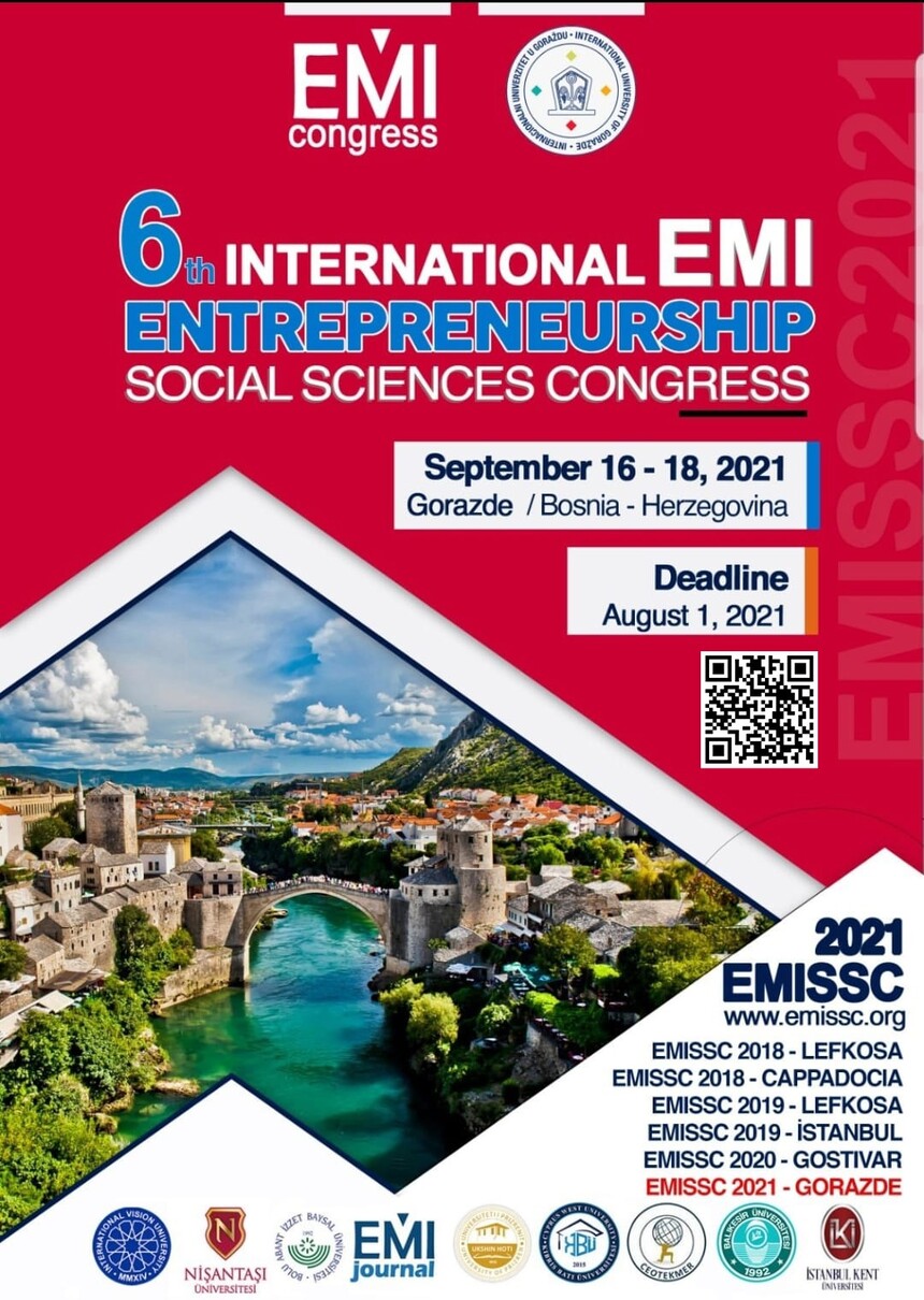 The sixth EMI Congress will be held in International Gorazde University (Bosnia and Herzegovina) on 16-18 September 2021. It will be organized with the collaborations of CEOTEKMER Technology Center, Bolu Abant İzzet Baysal University, Balıkesir University, Cyprus West University, International Vision University, University of Prizren, İstanbul Kent University and İstanbul Nişantaşı University. At the fifth congress, papers from 141 different universities and institutions and 26 different countries were presented. The congress meets the criteria for associate professorship, academic promotion and assignment.